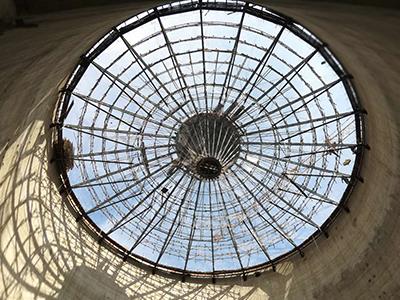 浅圆仓穹顶支架模板支撑采用的是支架模板进行支撑体系,它的特点有:(1)在仓内地面进行组装支架,在仓壁顶处安装电葫芦,然后采用同步提升钢桁架到预定的高度进行安装就位;(2)钢桁架作为浅圆仓穹顶结构的模板支撑平台,那么要控制下穹顶斜屋面模板和平面模板支撑高度,保证模板安装拆除速度和减少钢管材料用量,从而降低工人的工作量;(3)浅圆仓穹顶支架可以回收利用和周转;(4)可以减少施工人员不必要的高空作业时间,也可以降低高空作业的分险。